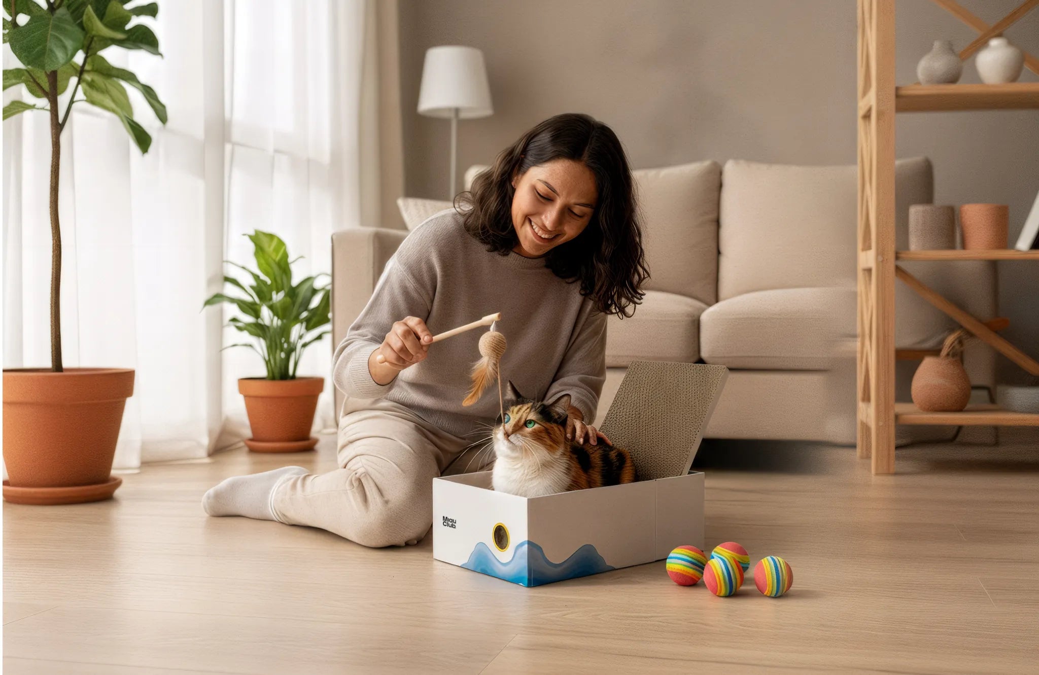 Nuestro rascador está diseñado para que tu gato rasque, juegue y descanse en un solo lugar. Hecho en cartón corrugado premium y con diseño minimalista que combina con tu hogar 🏡